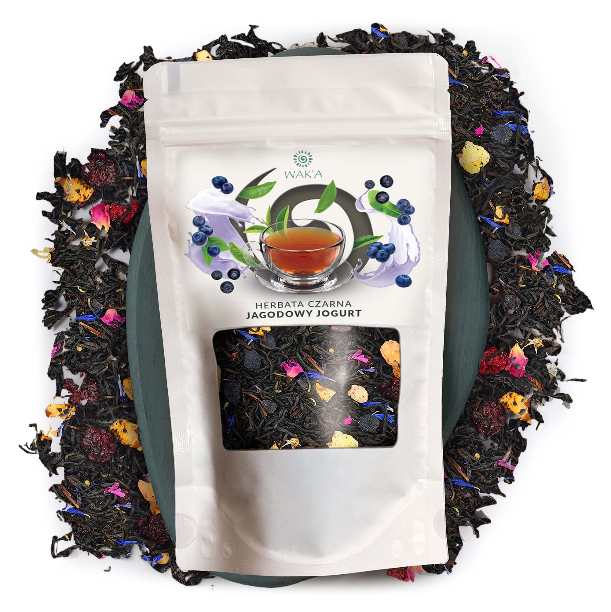 Herbata czarna Jagodowy Jogurt – eleganckie opakowanie 100g w szczelnym doypacku z okienkiem i zamkiem zip-lock, które chroni świeżość oraz intensywny aromat mieszanki.