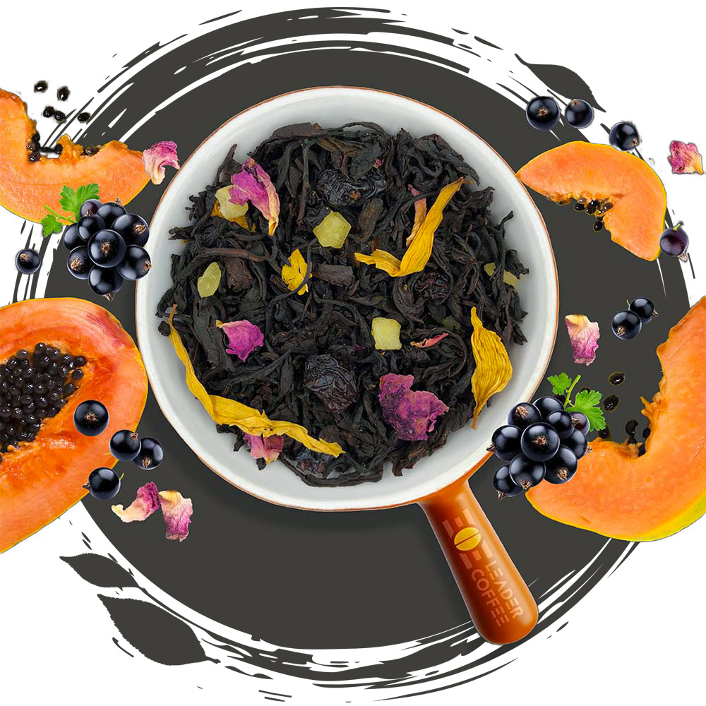 Wysokiej jakości indyjska czarna herbata połączona z owocami czerwonej porzeczki i żurawiny oraz kandyzowaną papają i ananasem. Dopełniona płatkami i pąkami kwiatów oraz naturalnym aromatem tworzy wyjątkowo barwną, lekko słodką i pełną świeżości kompozycję. Idealna dla miłośników intensywnych, owocowo-kwiatowych mieszanek.
