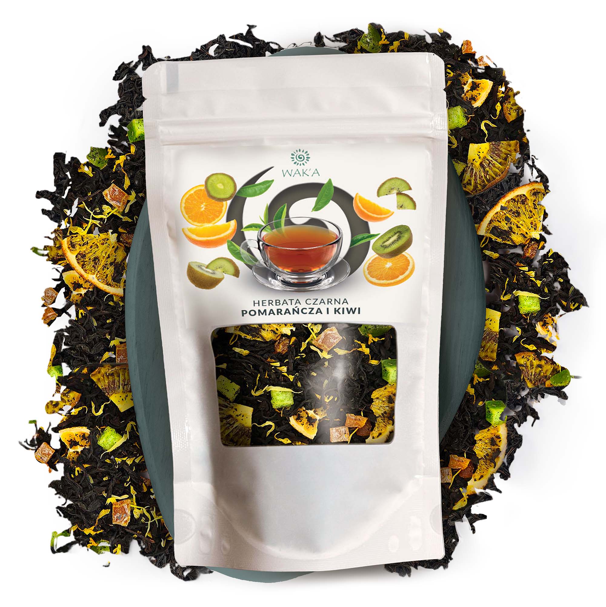 Herbata czarna Pomarańcza i Kiwi – eleganckie opakowanie 100g w szczelnym doypacku z okienkiem i zamkiem zip-lock, które chroni świeżość i aromat mieszanki.