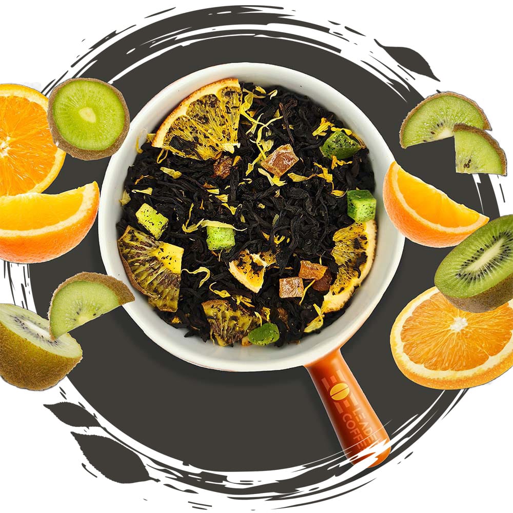 Wysokiej jakości czarna herbata cejlońska wzbogacona kawałkami pomarańczy i kiwi oraz ich naturalnymi owocami kandyzowanymi. Delikatne płatki nagietka i naturalny aromat nadają mieszance orzeźwiający, cytrusowo-owocowy charakter. Idealna dla miłośników lekkich, świeżych i pełnych energii kompozycji.