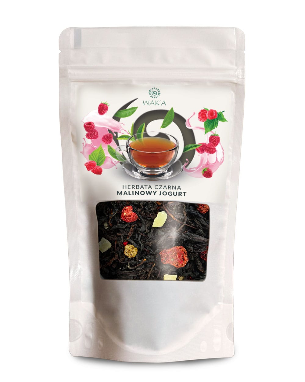 Herbata czarna Malinowy Jogurt – eleganckie opakowanie 100g w szczelnym doypacku z okienkiem i zamkiem zip-lock, który chroni przed utratą aromatu i zachowuje świeżość herbaty.