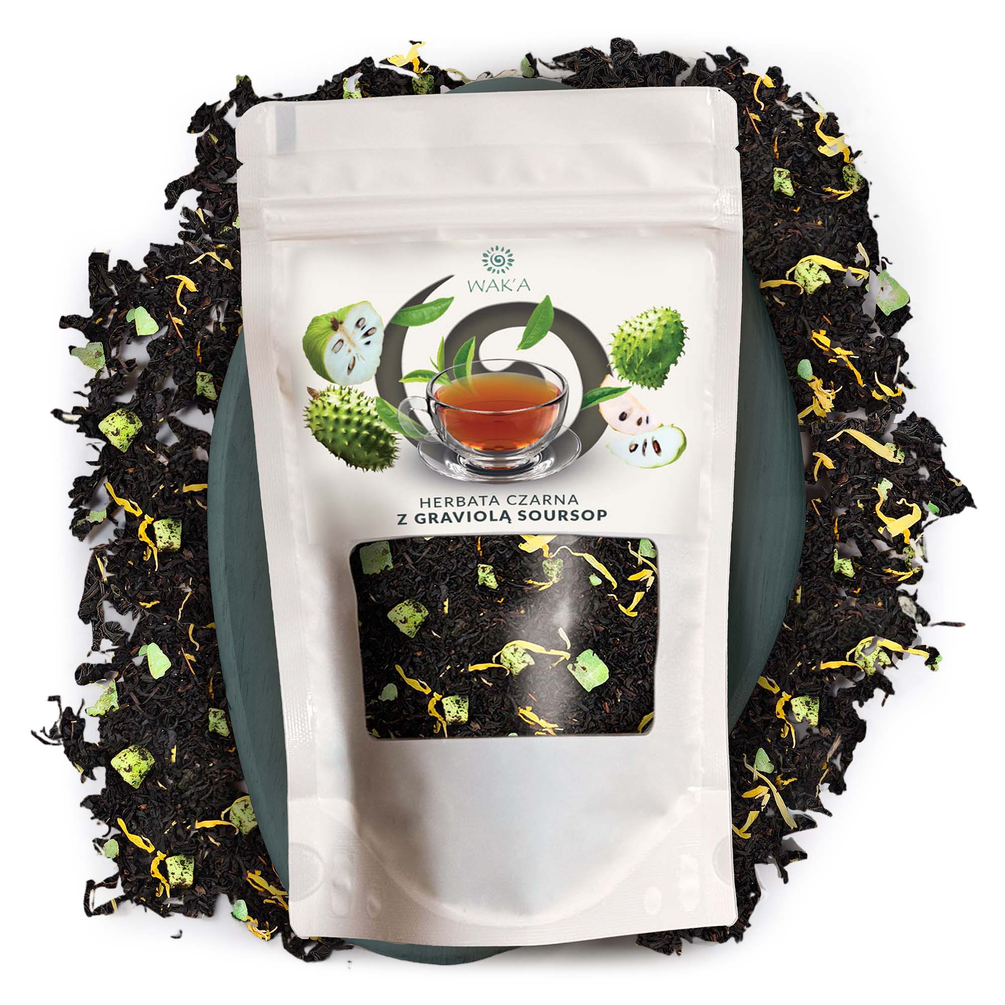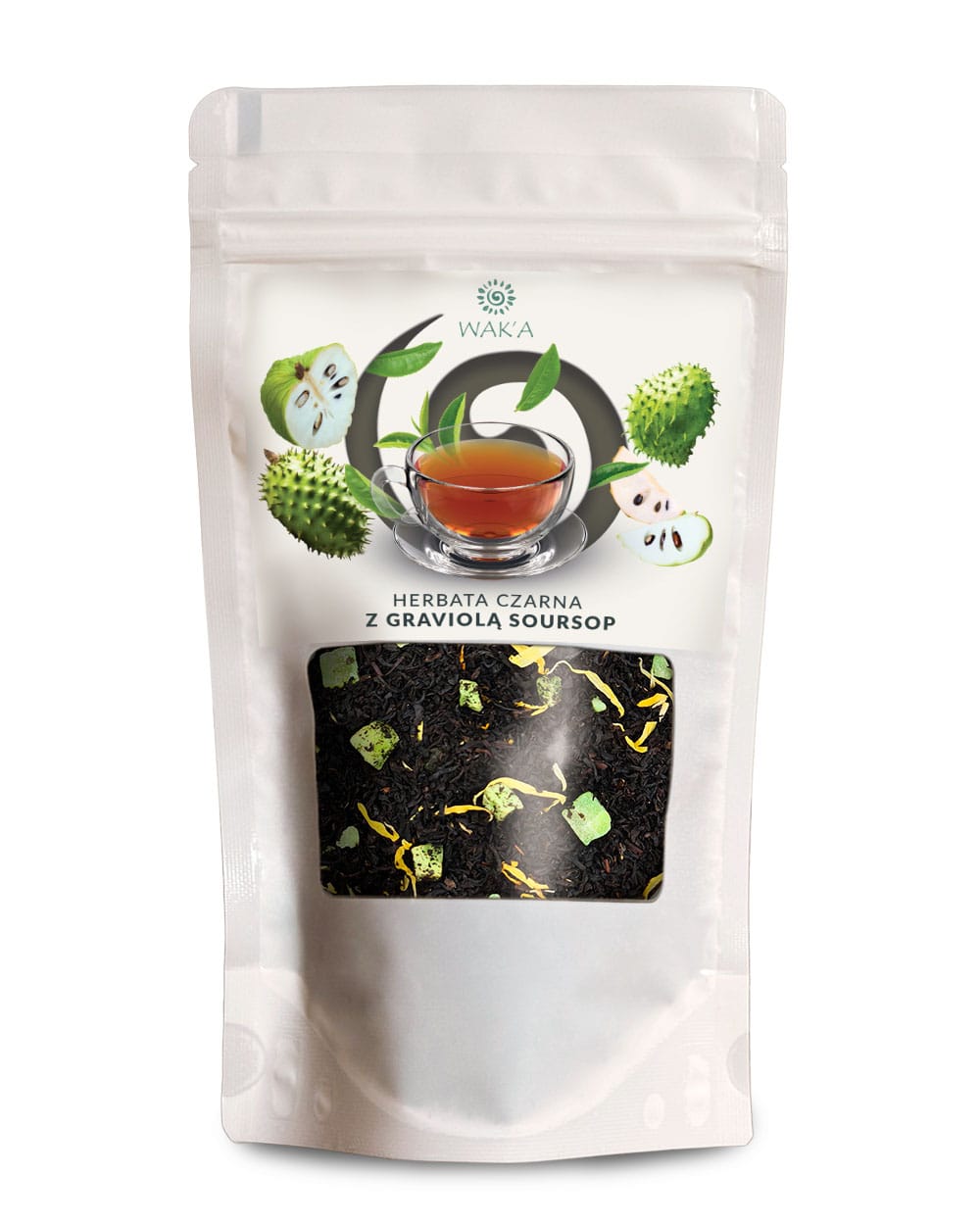WAKA Herbata czarna z graviolą Soursop – eleganckie opakowanie 100g w szczelnym doypacku z okienkiem i praktycznym zamkiem zip-lock. Cejlońska herbata czarna wzbogacona suszoną graviolą, jabłkiem i aromatycznymi płatkami słonecznika.