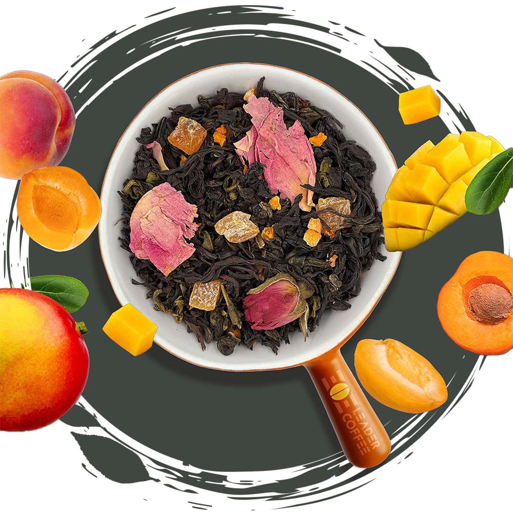 Kolorowa mieszanka – czarna i zielona herbata z soczystymi kawałkami mango i moreli oraz płatkami róży. Owocowy, słodki aromat i wyjątkowy wygląd mieszanki sprawiają, że każda filiżanka jest niezwykłym doświadczeniem.