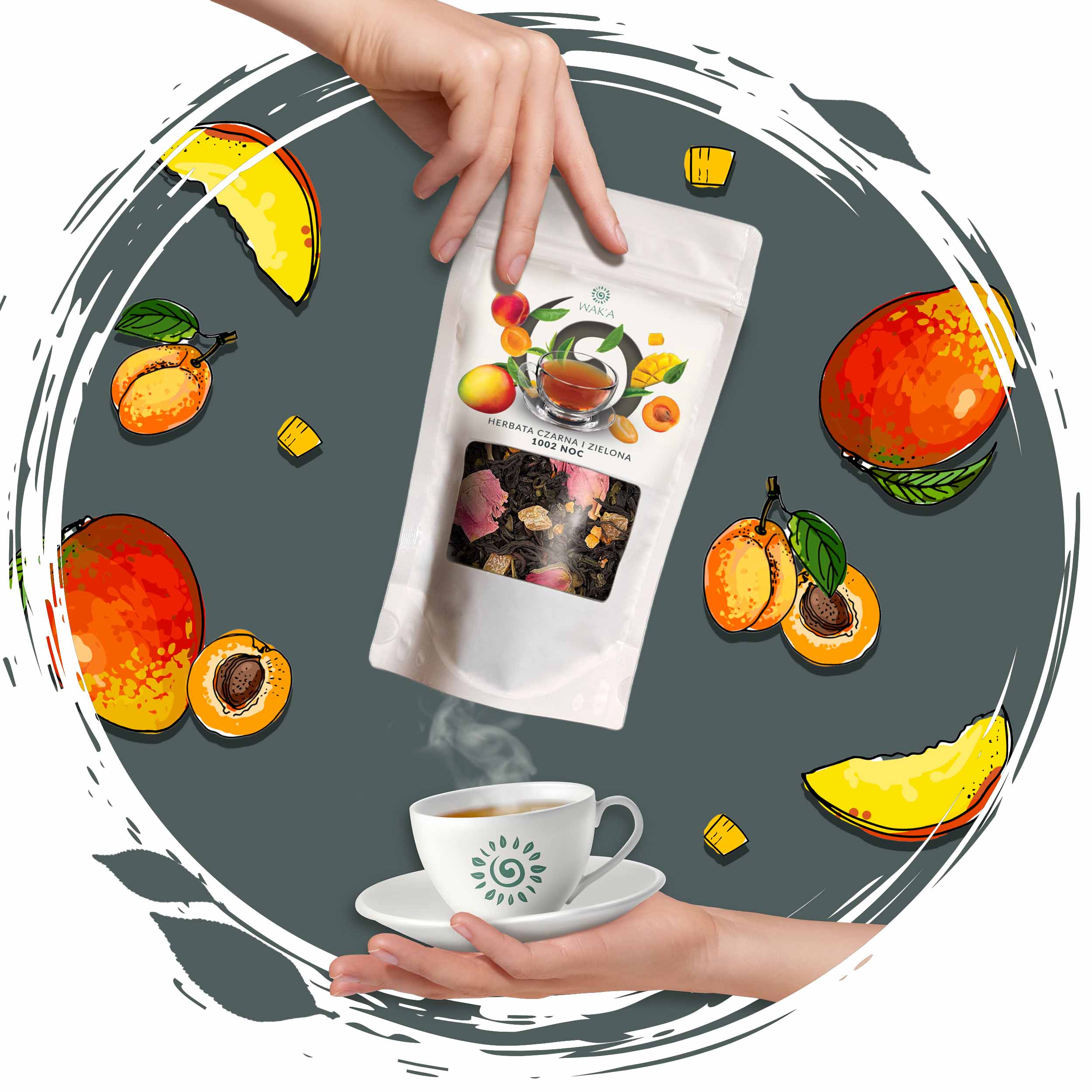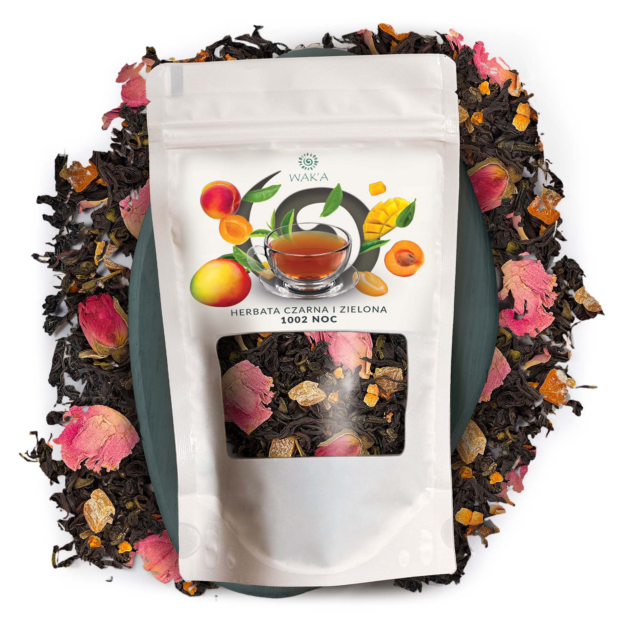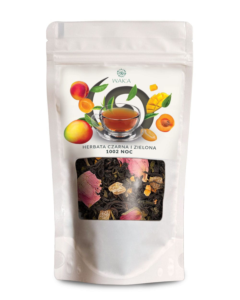WAKA Herbata czarna i zielona 1002 Noc – eleganckie opakowanie 100g w szczelnym doypacku z okienkiem i praktycznym zamkiem zip-lock. Połączenie czarnej herbaty cejlońskiej i zielonej chińskiej z dodatkiem moreli, mango oraz płatków róży.