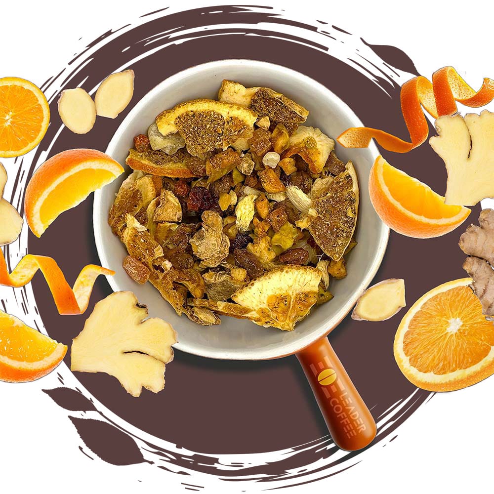 Rozgrzewająca mieszanka suszonego imbiru z liofilizowanymi kawałkami pomarańczy i grejpfruta. Uzupełniona skórką pomarańczową, jabłkiem, rodzynkami oraz owocami kaliny i czerwonej porzeczki. Delikatne płatki mięty i naturalne owoce kandyzowane nadają kompozycji świeżo-cytrusowy, intensywnie aromatyczny charakter. Idealna na chłodniejsze dni.