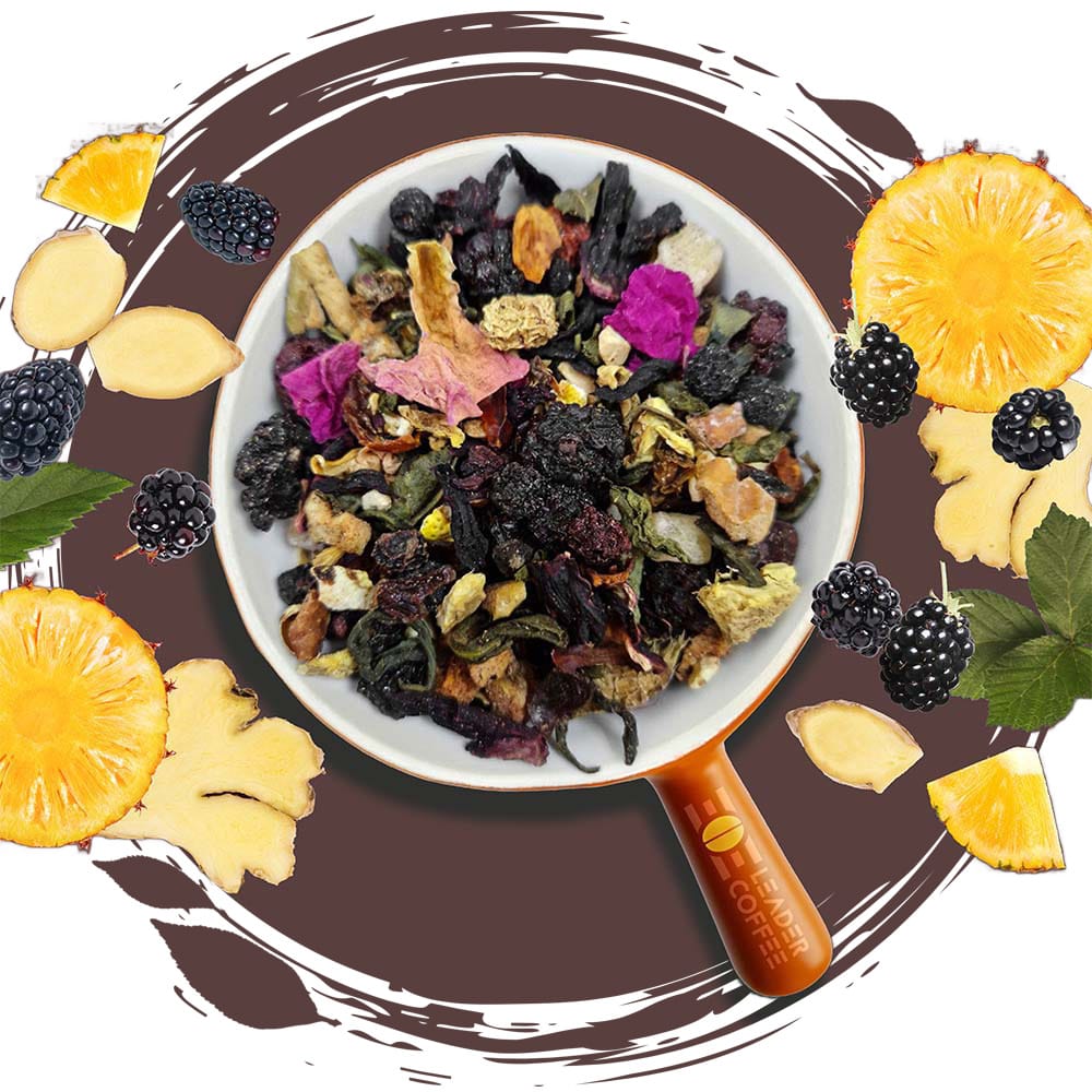Aromatyczna kompozycja płatków hibiskusa z ananasem, jabłkiem, jeżyną oraz nutą imbiru i skórki pomarańczowej. Wzbogacona aroniią, skórką dzikiej róży, jarzębiną czerwoną oraz wysokiej jakości zieloną herbatą chińską. Dodatek skórki cytryny, płatków kwiatów i naturalnego aromatu nadaje mieszance świeży, owocowo-ziołowy charakter. Idealna dla miłośników lekkich, harmonijnych naparów.