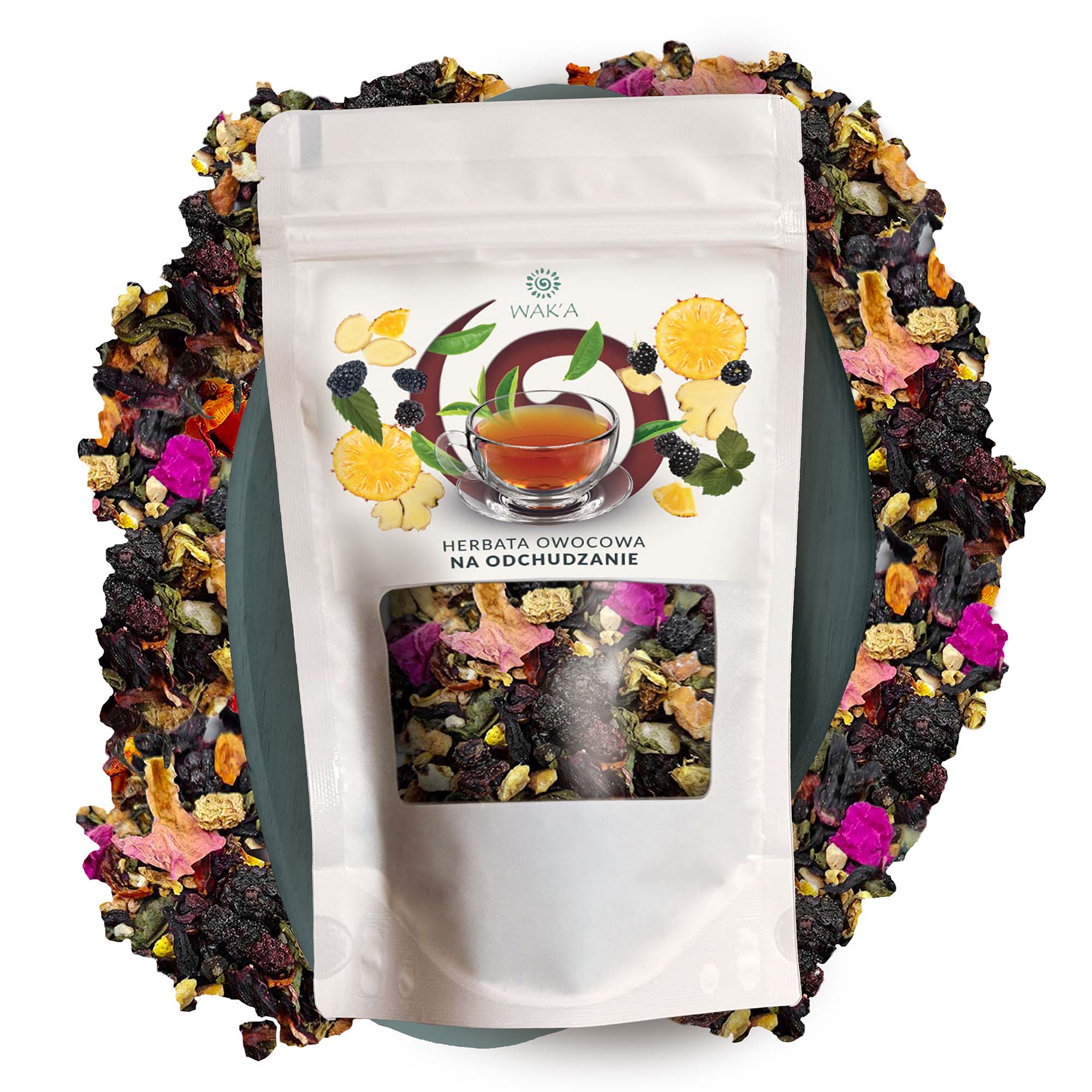 Herbata owocowa na odchudzanie – eleganckie i praktyczne opakowanie 100g w formie doypacku z okienkiem i zamkiem zip-lock, które pozwala zachować świeżość owocowej mieszanki.