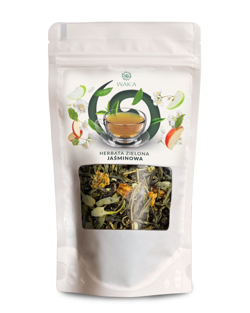 Herbata zielona Jaśminowa – eleganckie opakowanie 100g w praktycznym doypacku z okienkiem i zamkiem zip-lock, które zapewnia świeżość i wygodę przechowywania.