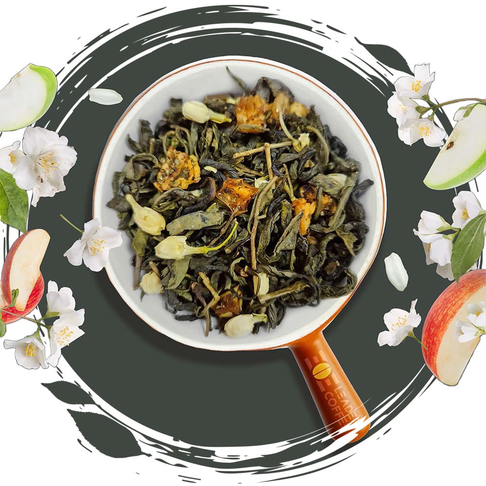 Delikatna kompozycja zielonej herbaty z płatkami jaśminu i suszonym jabłkiem. Lekko kwiatowy aromat harmonijnie łączy się z subtelną słodyczą owoców.