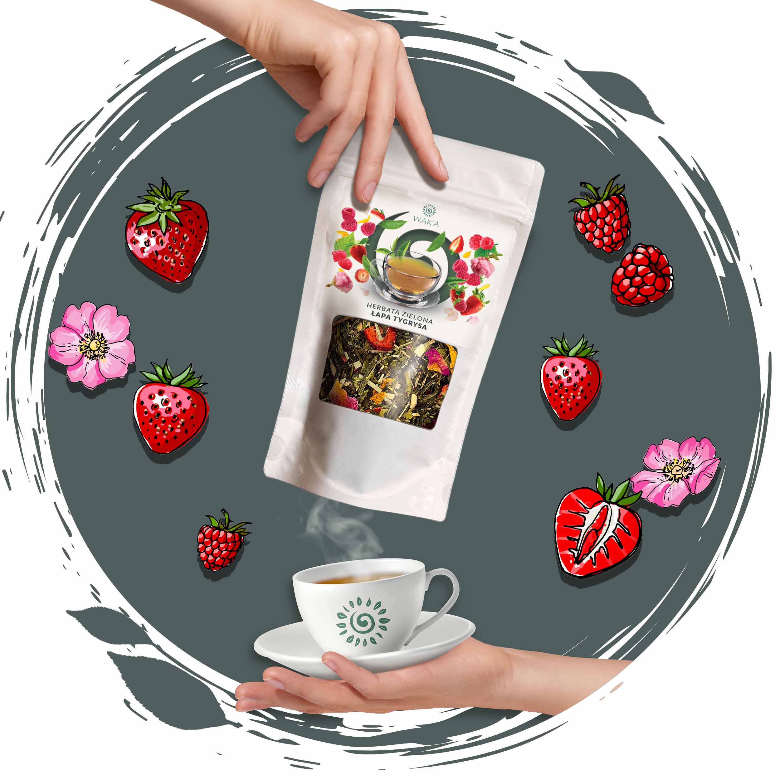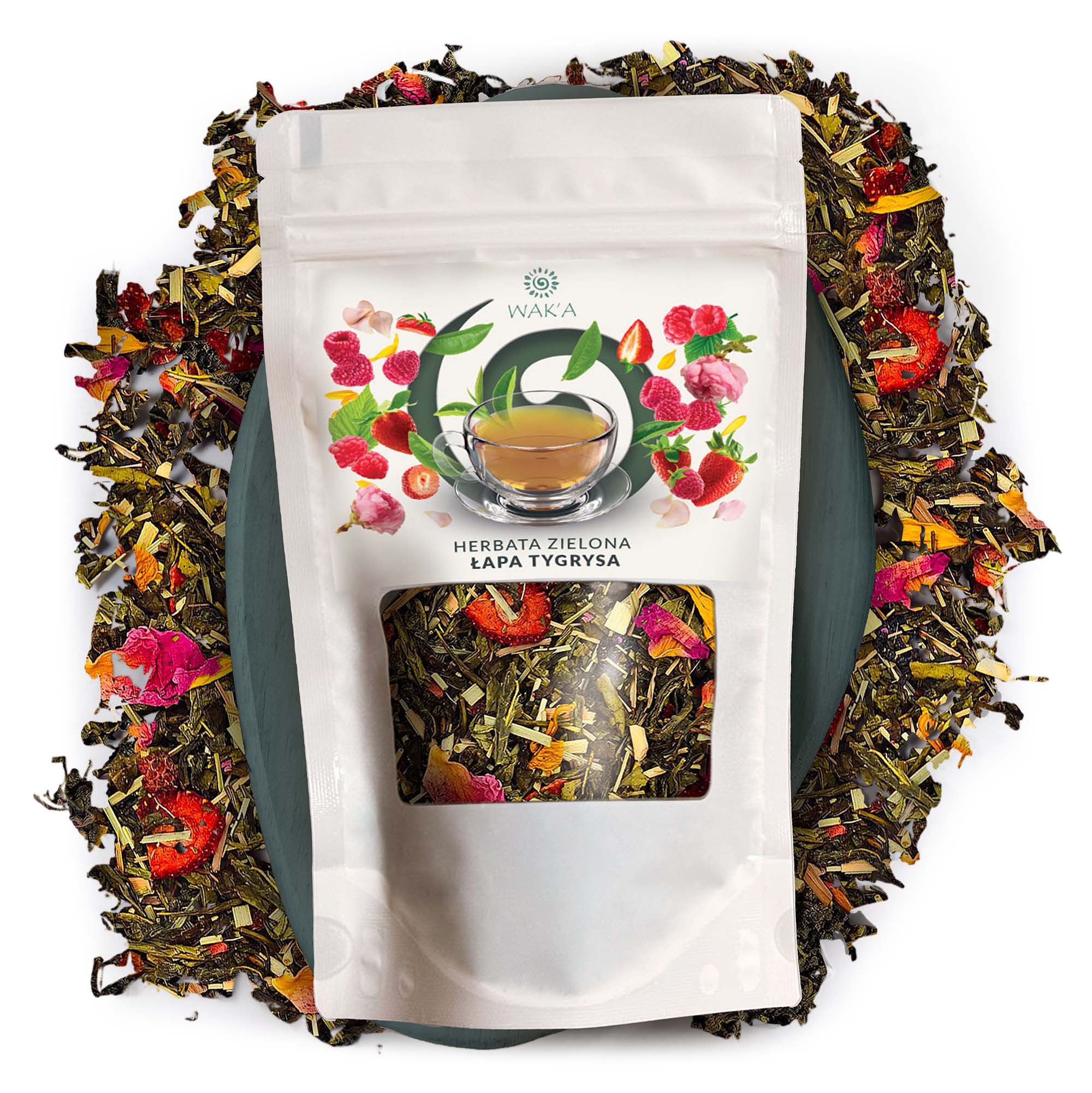 Herbata zielona Łapa Tygrysa – eleganckie opakowanie 100g w funkcjonalnym doypacku z okienkiem i zamkiem zip-lock, które utrzymuje świeżość owocowo-herbacianej mieszanki.