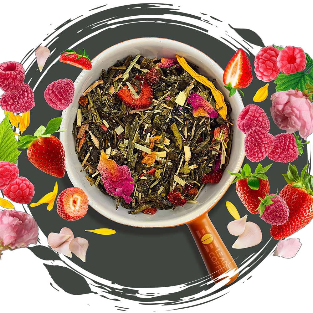 Energetyczna kompozycja zielonej herbaty z dodatkiem liofilizowanych truskawek, malin i owoców leśnych. Owocowa intensywność przełamuje delikatną bazę zielonej herbaty, tworząc smak pełen charakteru.