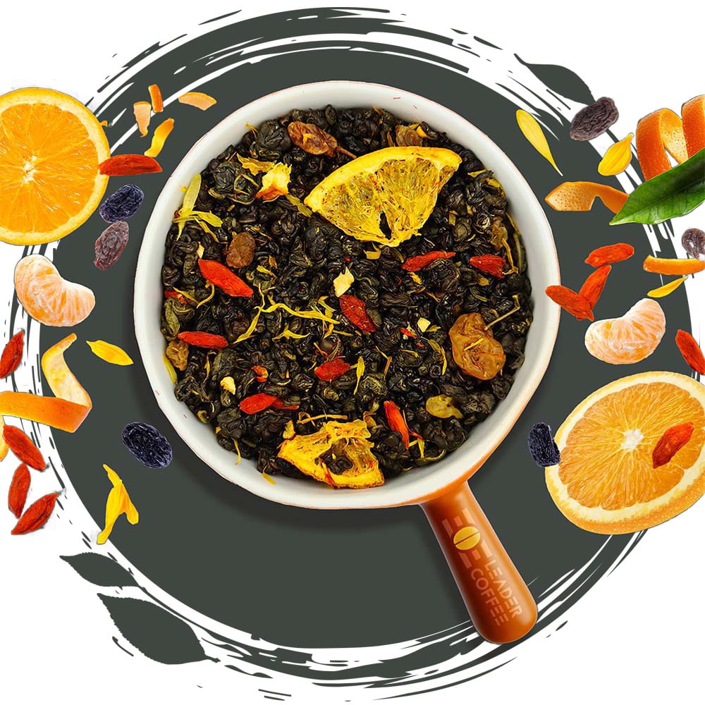 Liście herbaty klasy Premium – starannie selekcjonowane, aby wydobyć subtelny smak i aromat w połączeniu z owocami egzotycznymi.
