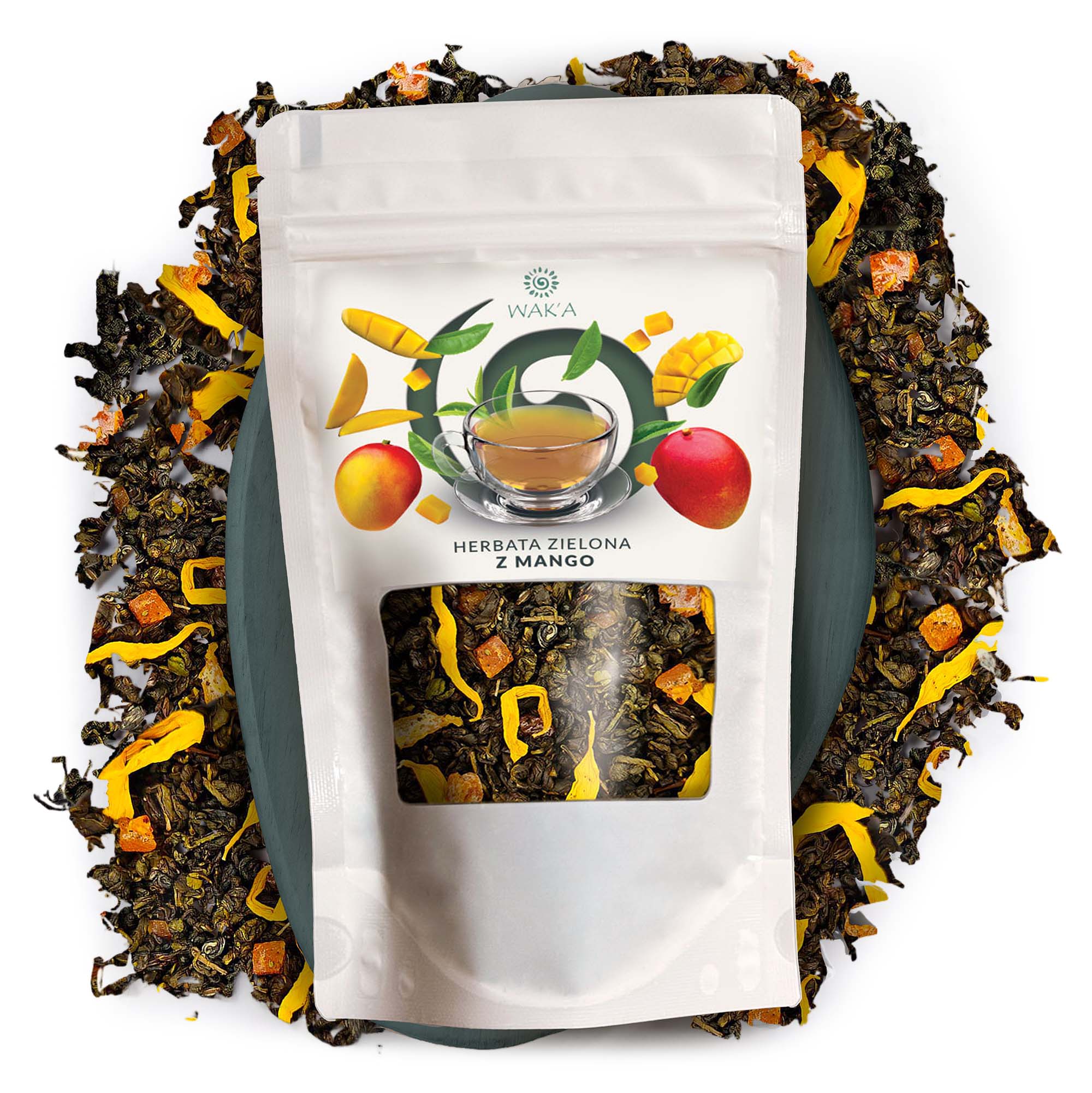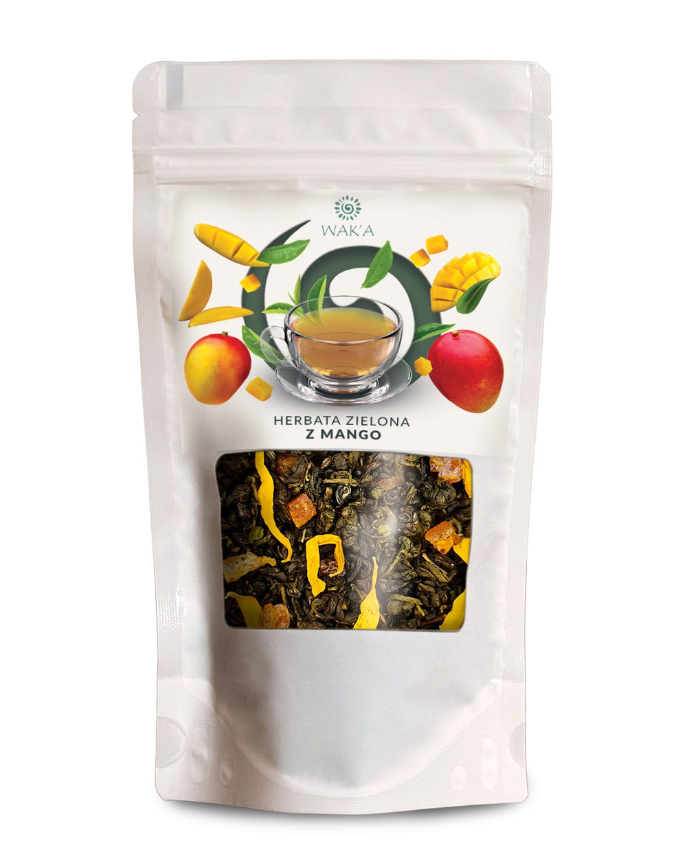 Herbata zielona z mango – eleganckie opakowanie 100g w praktycznym doypacku z okienkiem i zamkiem zip-lock, który chroni świeżość i egzotyczny aromat mieszanki.