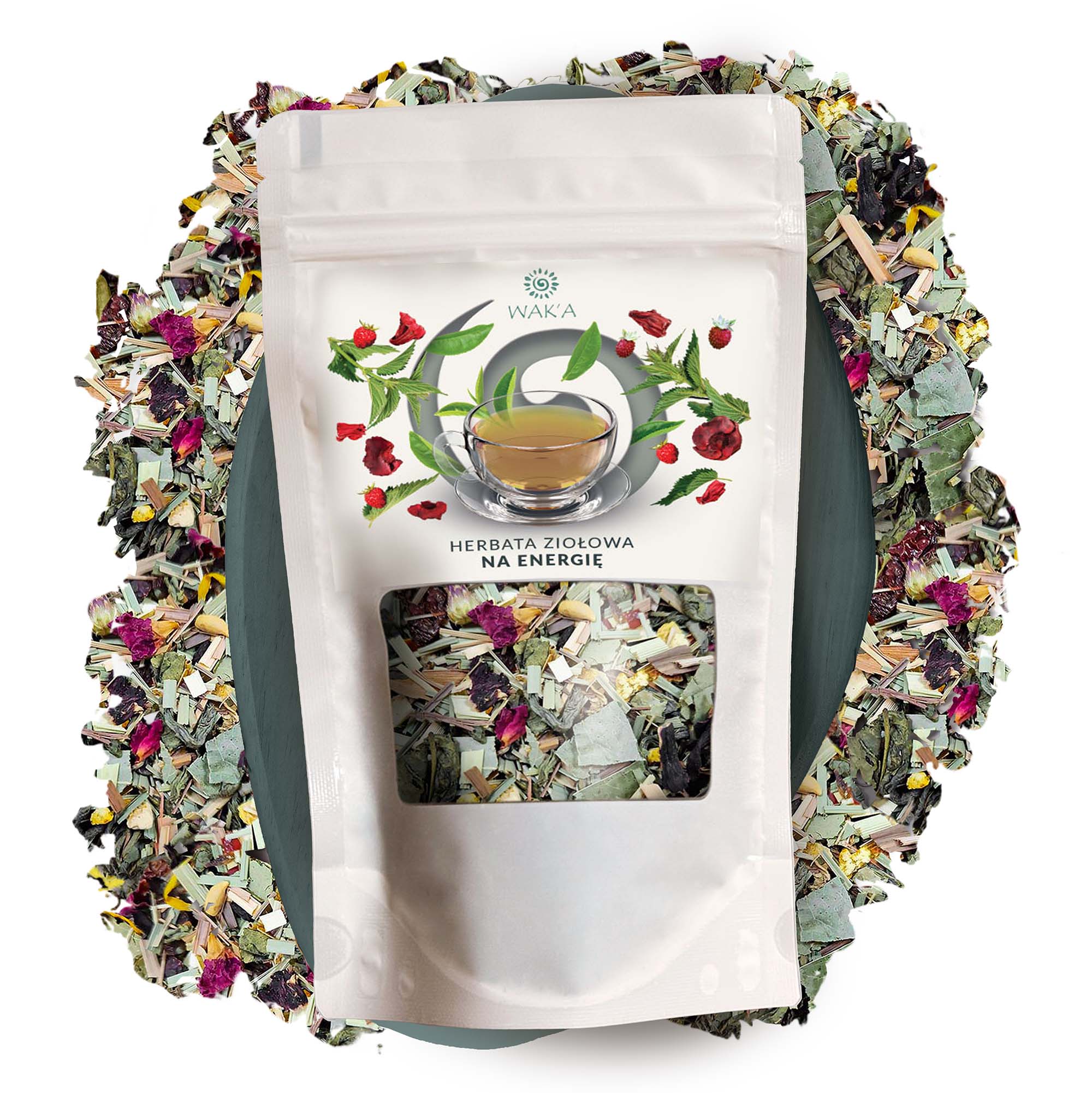 Herbata ziołowa na energię – eleganckie opakowanie 100g w szczelnym doypacku z okienkiem i zamkiem zip-lock, które chroni świeżość i aromat mieszanki.