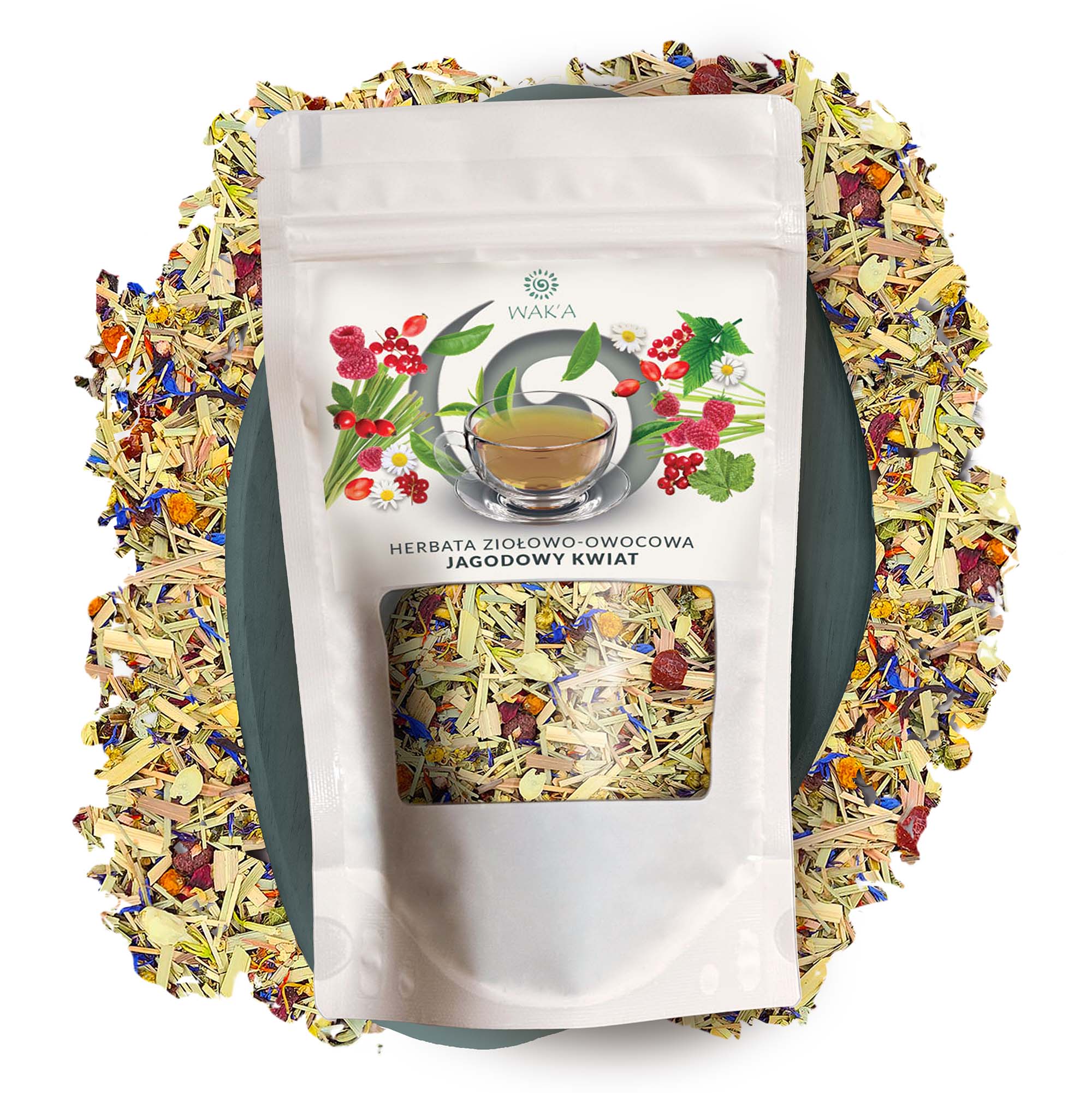 Herbata ziołowo-owocowa Jagodowy Kwiat – eleganckie opakowanie 100g w szczelnym doypacku z okienkiem i zamkiem zip-lock, które chroni świeżość i aromat mieszanki.