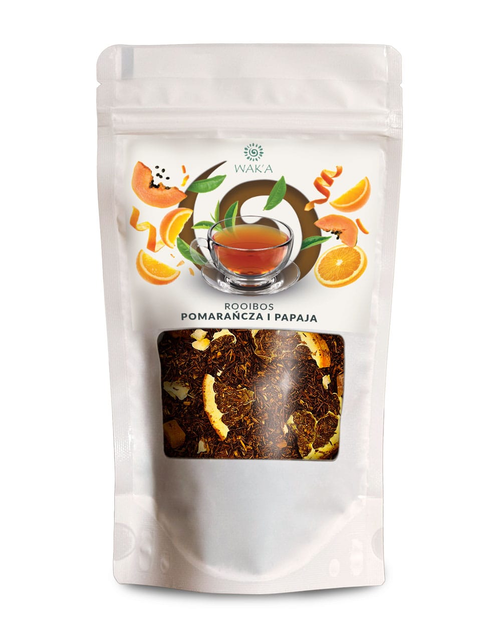Rooibos Pomarańcza i Papaja – eleganckie opakowanie 100g w praktycznym doypacku z okienkiem i zamkiem zip-lock, które utrzymuje świeżość i intensywność aromatu mieszanki.