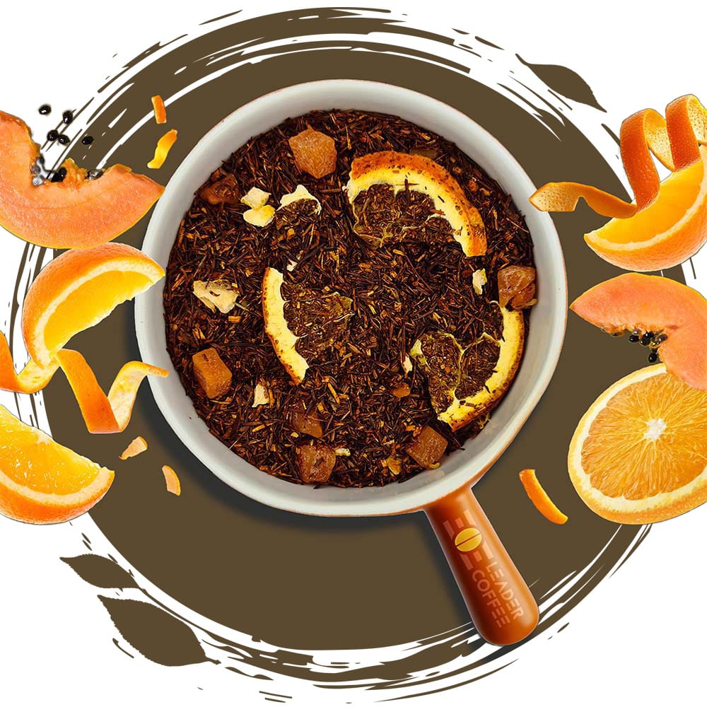 Egzotyczna kompozycja liści rooibosa z kawałkami papai i pomarańczy oraz skórką cytrusów. Owocowa świeżość przełamuje naturalną słodycz rooibosa, tworząc wyjątkowy napar bez kofeiny.